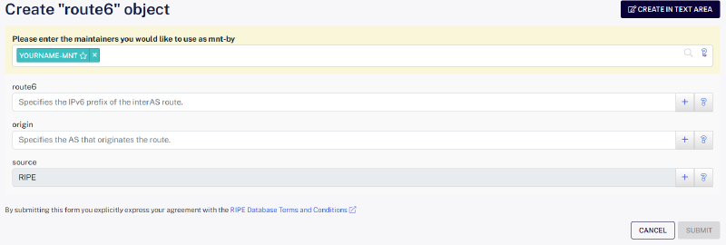 In the route(6?) field, the given IP range by the RIPE database, as marked above, and the origin is your ASN in the format ASxxxxxx. Then click on submit, and now you will see the IRR mention on your resources.